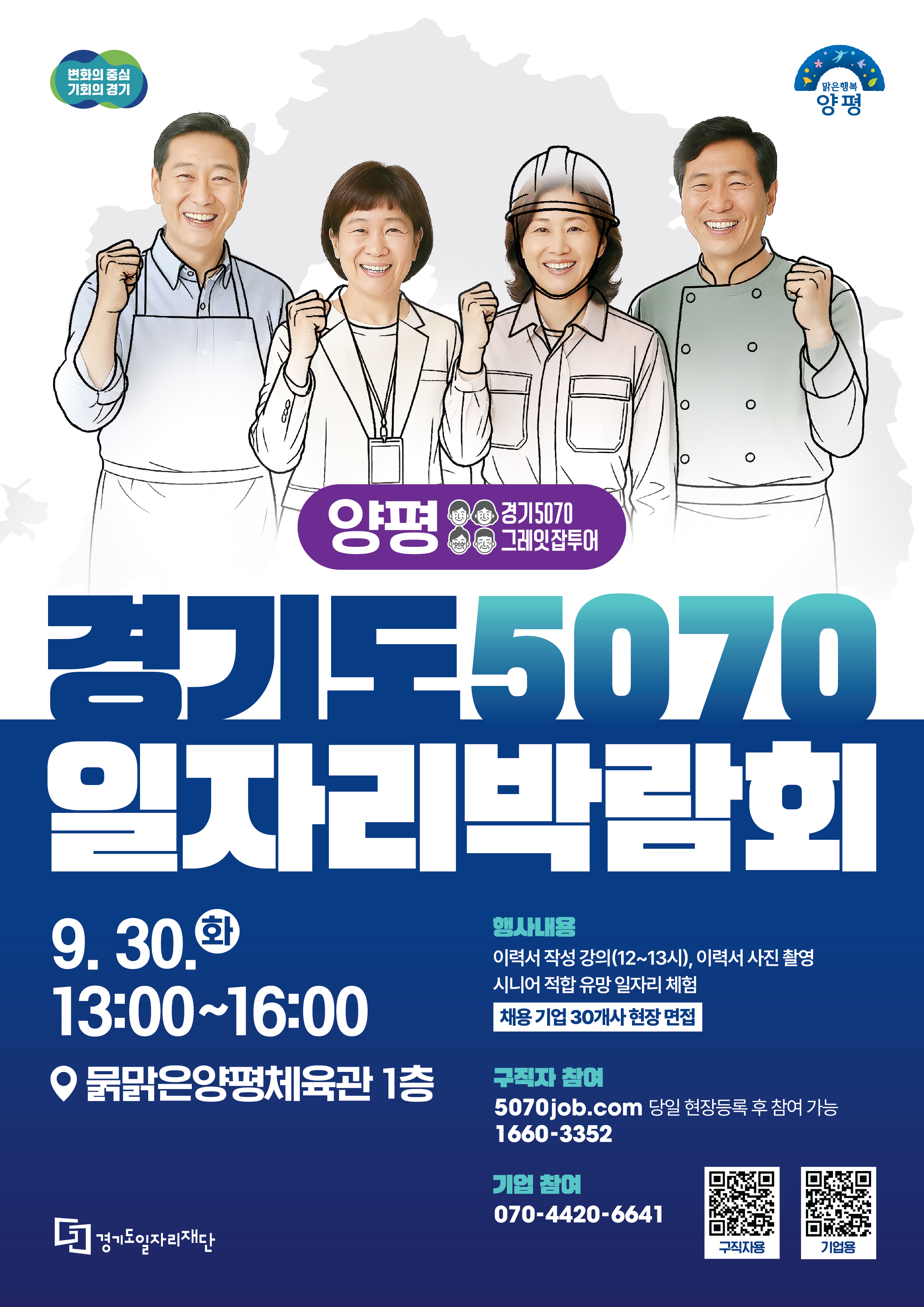 경기도 5070 일자리박람회가 9월에는 중장년 일자리 제공을 위해 경기도 구석구석을 찾아 다녔습니다. 9월 마지막은 30일에 양평을 찾아 갑니다.