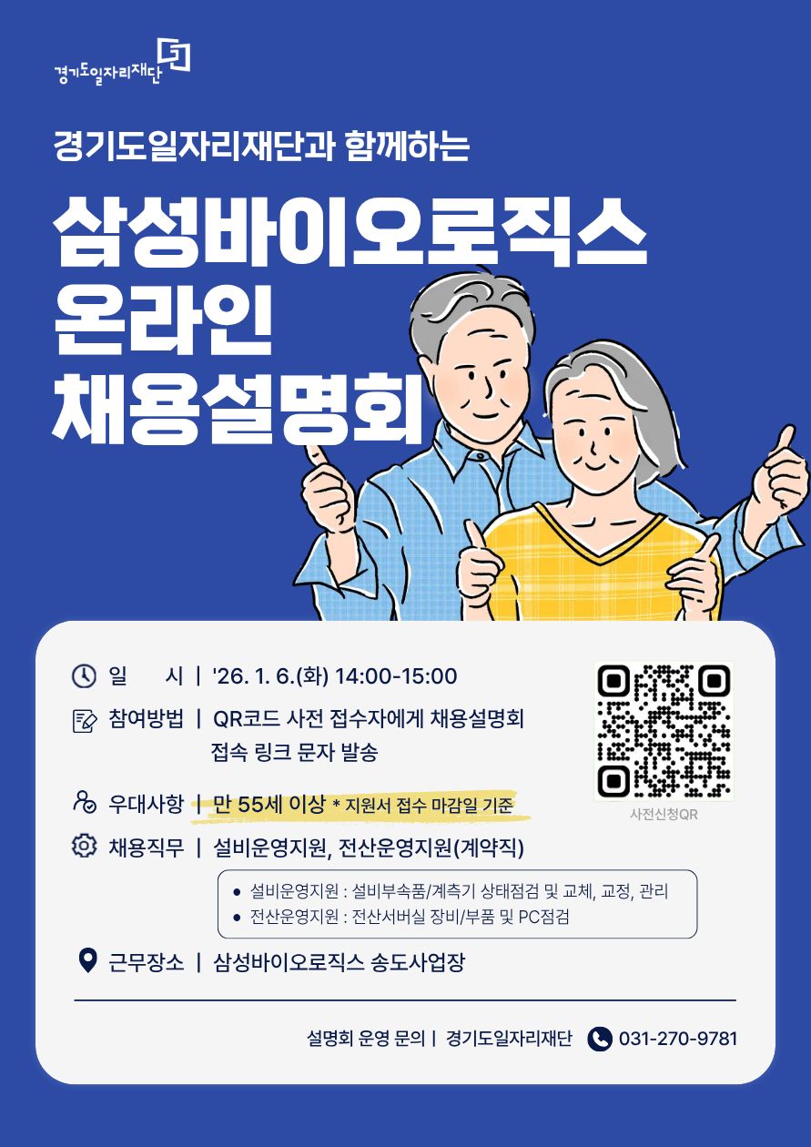 삼성바이오로직스에서 중장년, 시니어를 대상으로 온라인 채용설명회를 진행합니다.