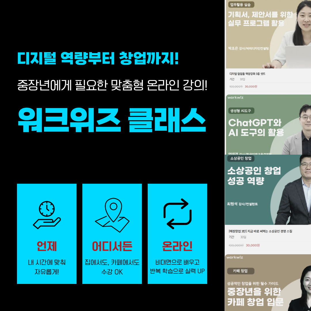 워크위즈 클래스는 바로 이러한 4060 중장년 세대의 고민을 해결하고, 실질적인 재도약 기회를 마련할 수 있도록 맞춤형 온라인 강의를 제공합니다.