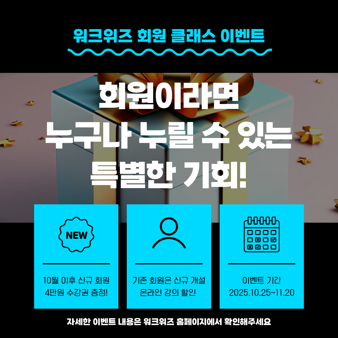 이벤트 기간 이후에는 수강료가 변동될 예정이니, 지금 바로 워크위즈 클래스에서 새로운 도전을 시작해 보시기 바랍니다!