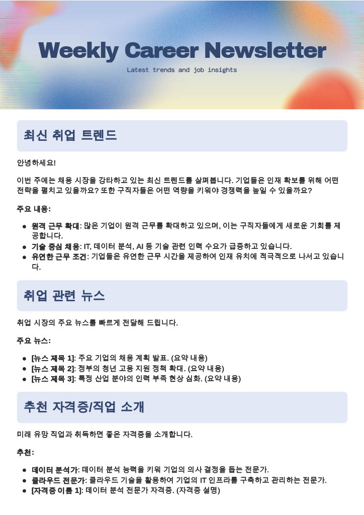 ‘내가 운영하는 브랜드의 뉴스레터를 제작 하려고 해. 크게 취업 트렌드, 취업 관련 뉴스, 자격증/직업 소개 로 나뉘어져. 이번 주 발행할 뉴스레터의 초안을 작성해줄래?’ |