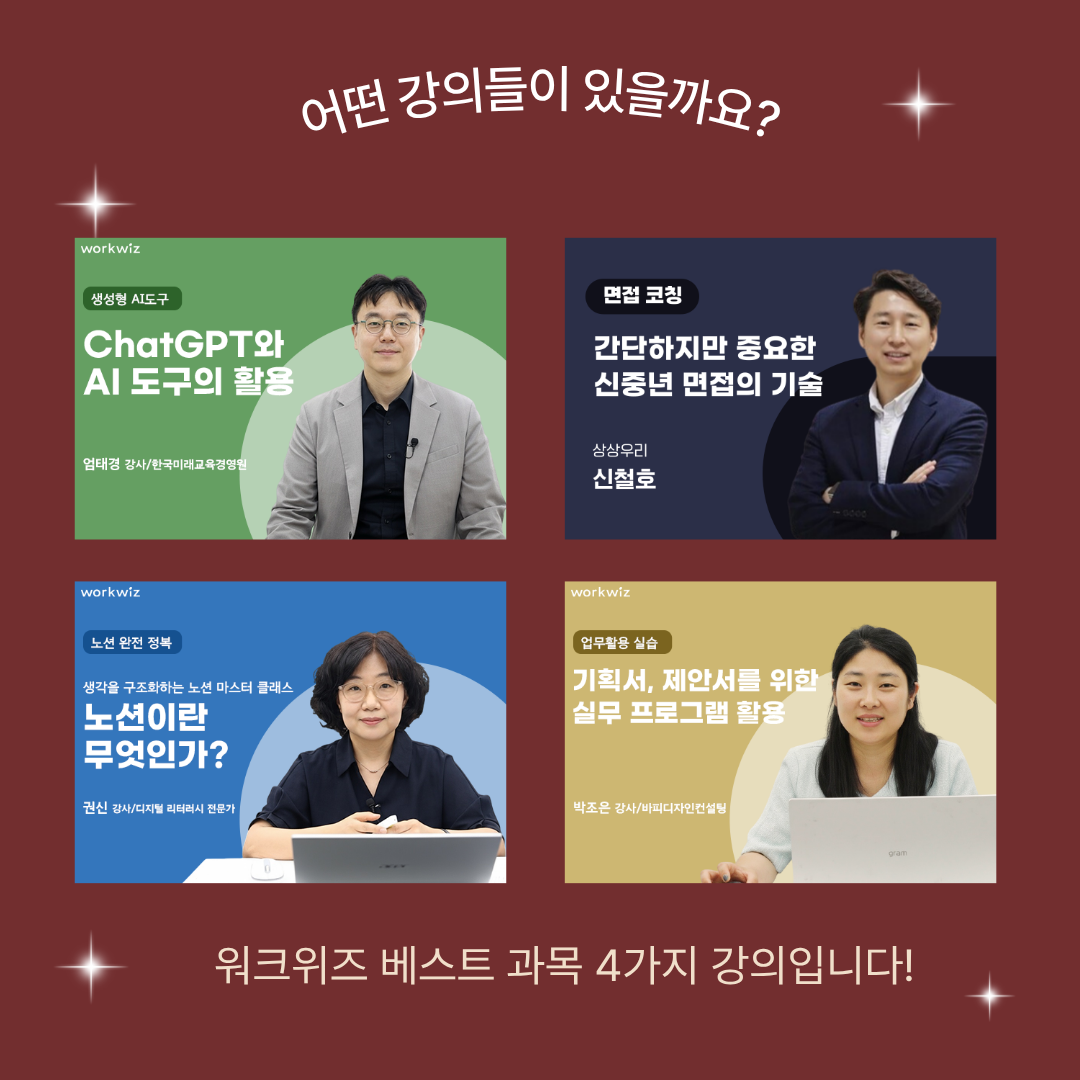 중장년 전문 커리어 플랫폼 <워크위즈>에는 온라인 강좌 '클래스' 사이트가 있답니다!