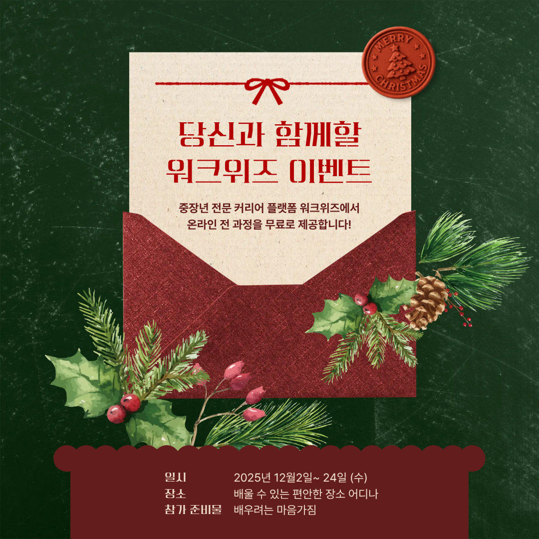 무료 클래스가 닫히기 전에 워크위즈 회원분들이 크리스마스 선물처럼 이 좋은 혜택을 누리시기 바랍니다.