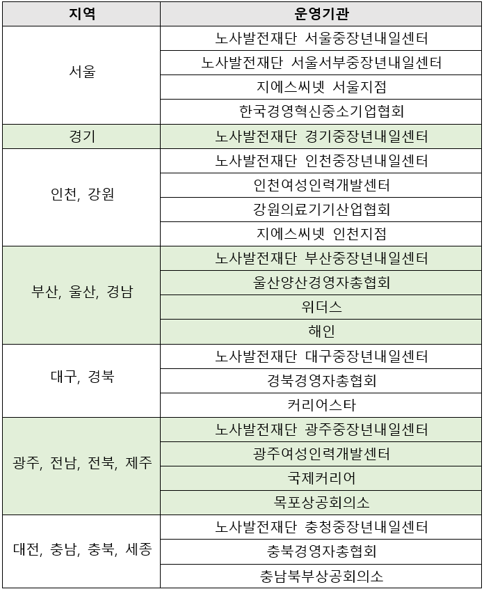 앞서 말했듯이, 올해는 다음주인 2월 19일에 모집이 시작되어요. 신청은 고용 24포털과 각 지역의 운영기관에서 가능합니다. 올해 선정된 지역별 운영기관은 아래에 이미지로 정리하여 알려드려요.