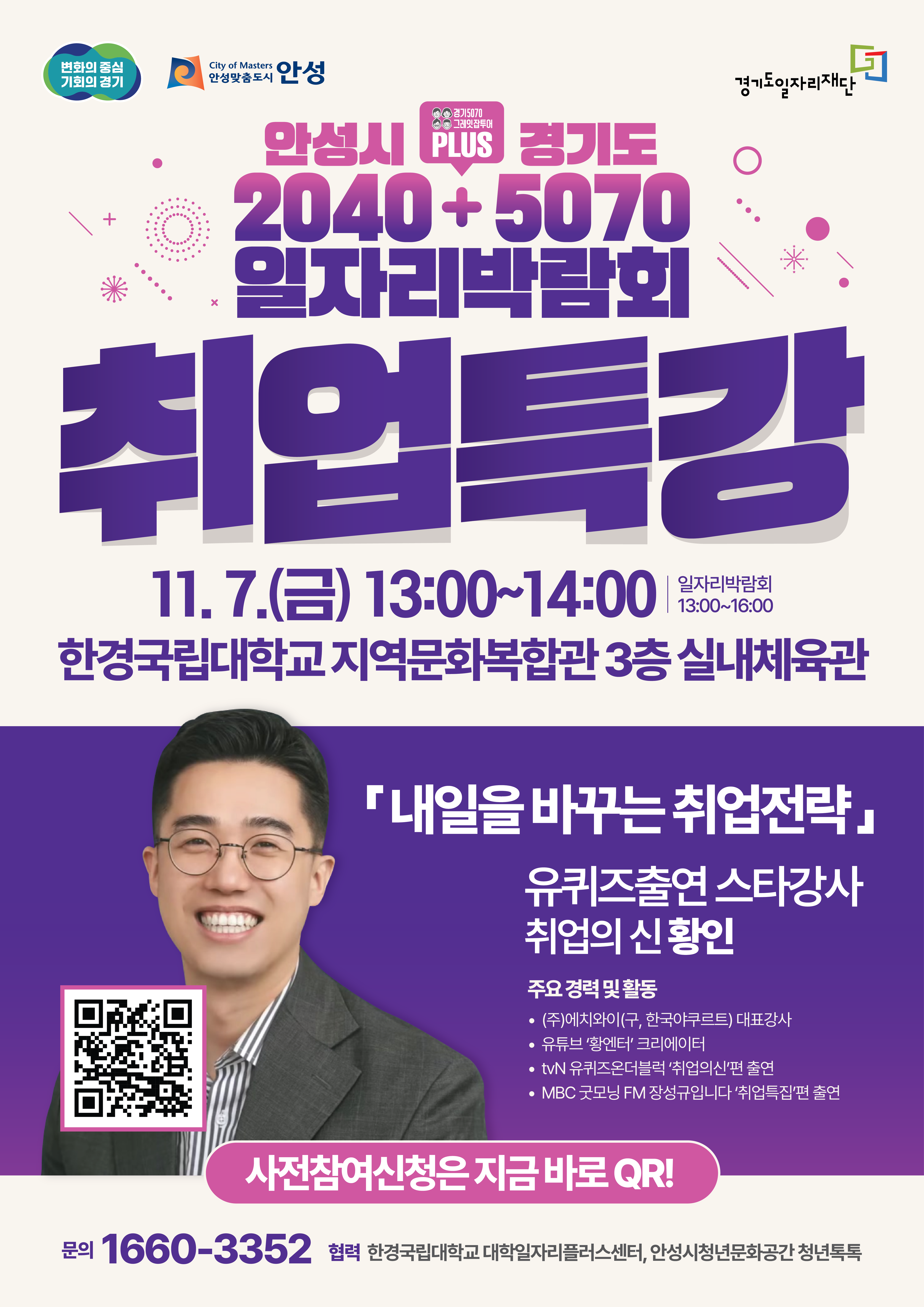 ♬ 따뜻한 희망을 담아, 경기도 5070 일자리 박람회가 안성을 찾아옵니다!깊어가는 가을, 새로운 시작을 꿈꾸는 5070 세대 여러분을 위한 특별한 만남이 안성에서 펼쳐집니다.이번 안성 박람회의 백미는 바로 '취업의 신'이라 불리는 황인 강사의 특별 강연입니다.강연 제목: '내일을 바꾸는 취업전략'특징: 현장 면접에 앞서 든든한 길잡이가 되어줄 이 강연은 사전 행사로 진행됩니다.면접 전에 황인 강사의 지혜로운 전략을 미리 듣고 힘찬 출발을 준비하시면 좋겠습니다.사전 신청을 통해 이 귀한 시간을 놓치지 마세요!
