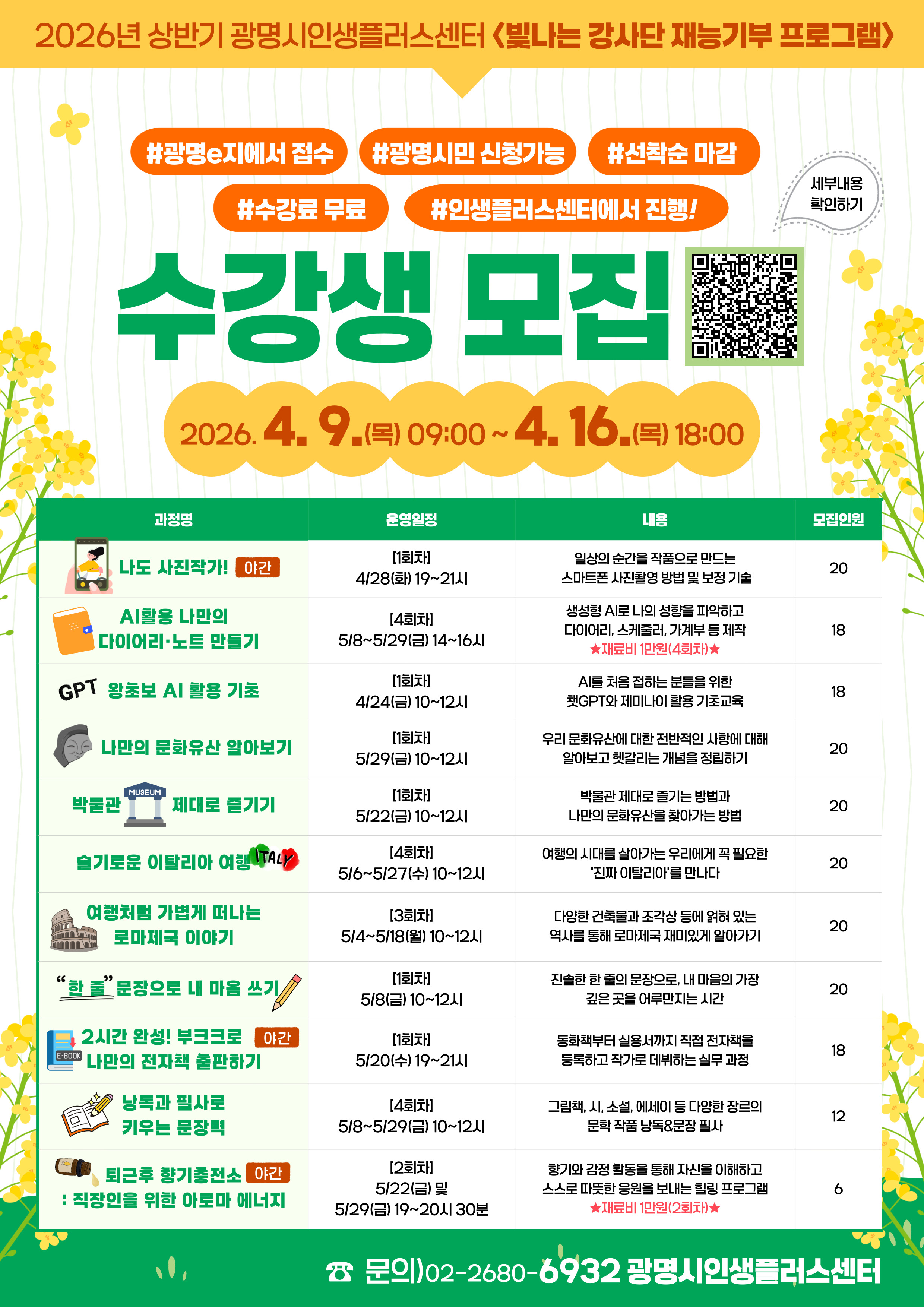 재능기부로 마련된 특별한 수업에 광명시민 여러분을 초대합니다!